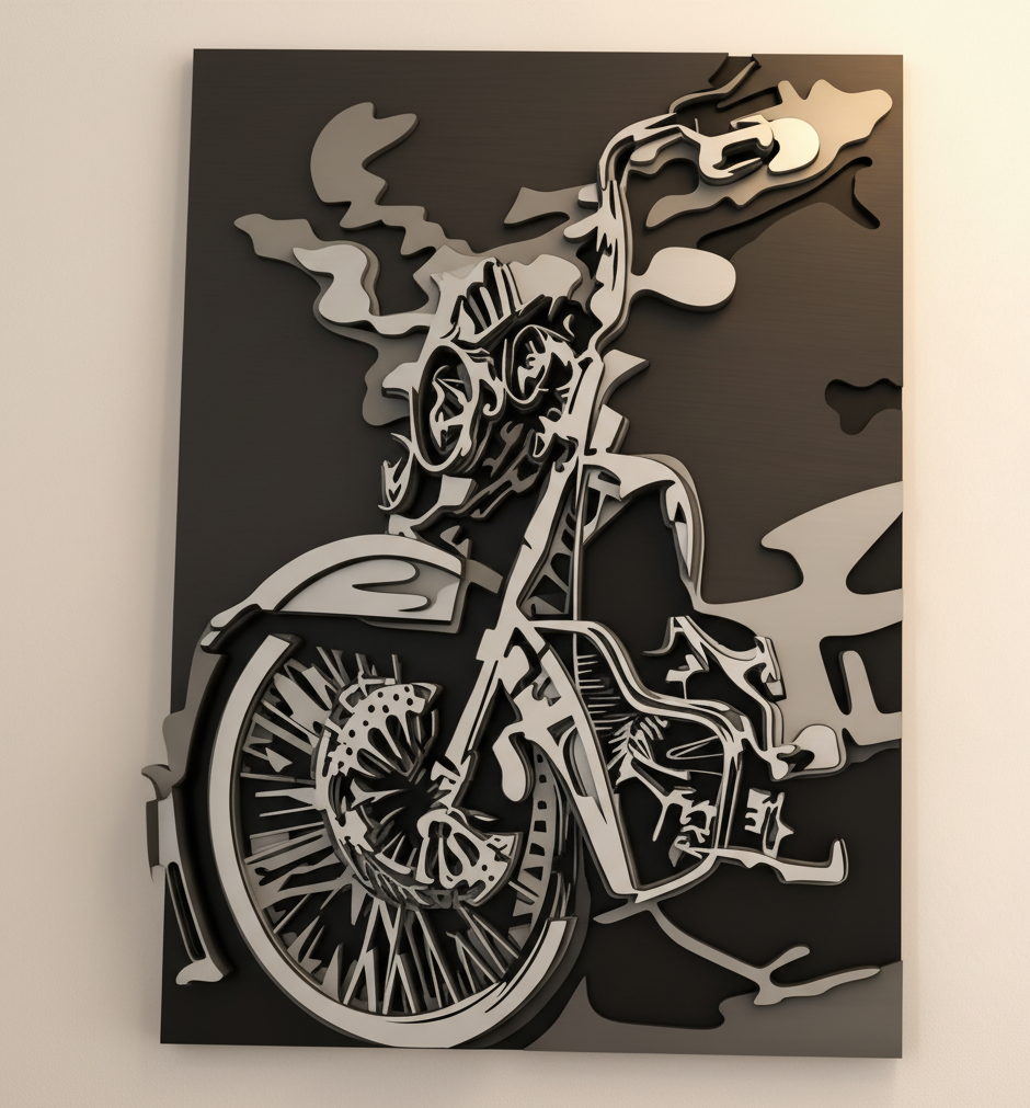 Dynamic 3D Effect: What truly sets this design apart is its multilayered structure. When assembled, the various layers create a fantastic 3D relief effect, giving depth and life to the motorcycle silhouette. This adds a sophisticated and high-end touch that simple flat designs can’t achieve.